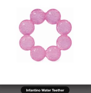 Of course Sophie the giraffe is another must. The long neck and legs give the baby a good angle and they can gnaw on that for comfort. Another option for discomfort and a low cost option is to boil some organic chamomile tea and soak a soft, clean washcloth in the tea. Then freeze in a ziplock. When the baby needs something soothing, pull it out of the freezer and let them chew on it. A teething ring is great too- Infantino makes a great water teether. Pop it in the freezer and let them enjoy the cool sensation on their gums. One thing I’ve noticed with Olive is she is not a big pacifier user, but what she does is chew on it for relief. So if you have a Natursutten pacifier on hand these work wonders for those painful gums.